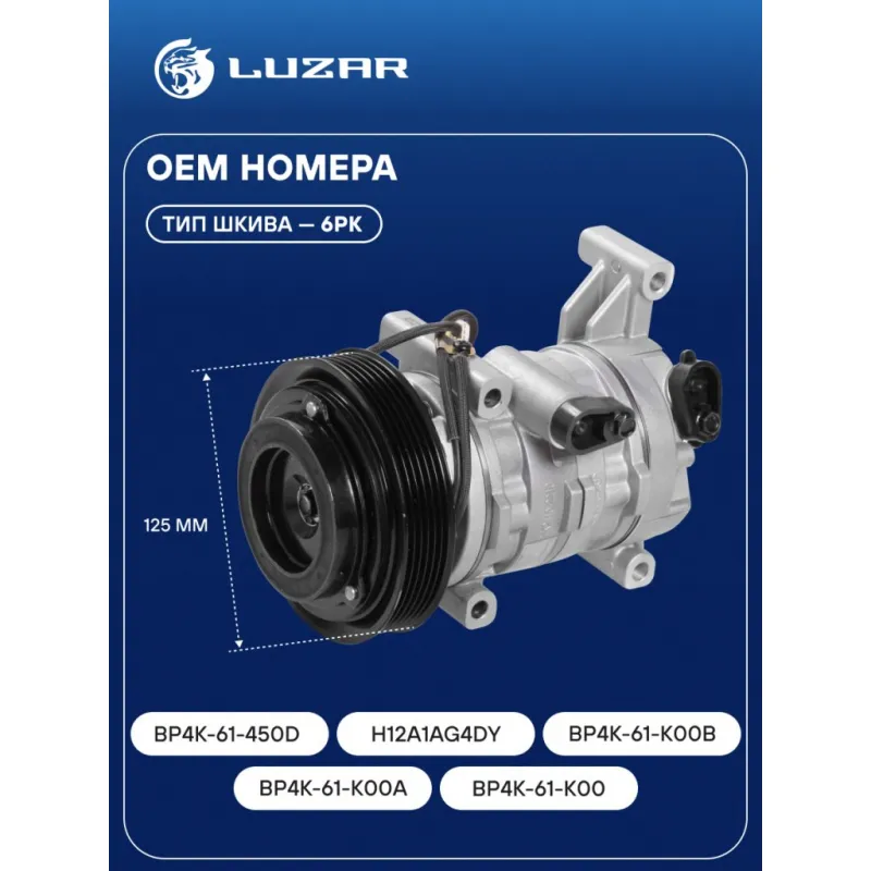 Компрессор кондиционера для автомобилей Mazda 3 (BK) (03-) 1.6i Характеристики: Артикул: LCAC 2540 OEM номера: BP4K-61-450D, H12A1AG4DY, BP4K-61-K00B, BP4K-61-K00A, BP4K-61-K00 Количество на автомобиль: 1 Объём заправленного масла, мл: 120±10 Вид хладагента: R134a Тип шкива: 6PK Диаметр шкива, мм: 125 Вид заправленного масла: PAG 46 Ид.№ компрессора: H12 Сопутствующий товар: Радиаторы кондиционера (конденсеры): LRAC 2548 Сопутствующий товар: Клапаны расширительные кондиционера (ТРВ): LTRV 2540 Сопутствующий товар: Ресиверы-осушители: LCR 2505 Мощность, кВт: 2 Подходит для авто: Mazda 3 (09-), 3 (03-) Для проверки применяемости отправьте VIN автомобиля через вкладку "Есть вопросы о товаре?" Комплектация: Компрессор кондиционера Паспорт изделия Гарантия: от 1 года.