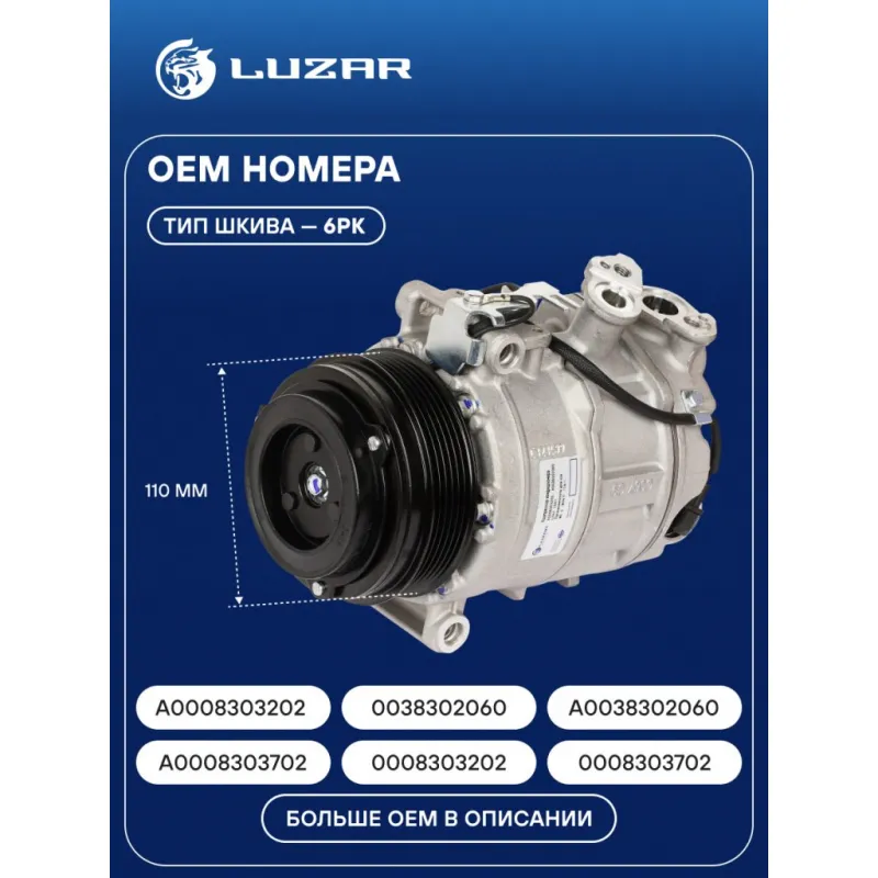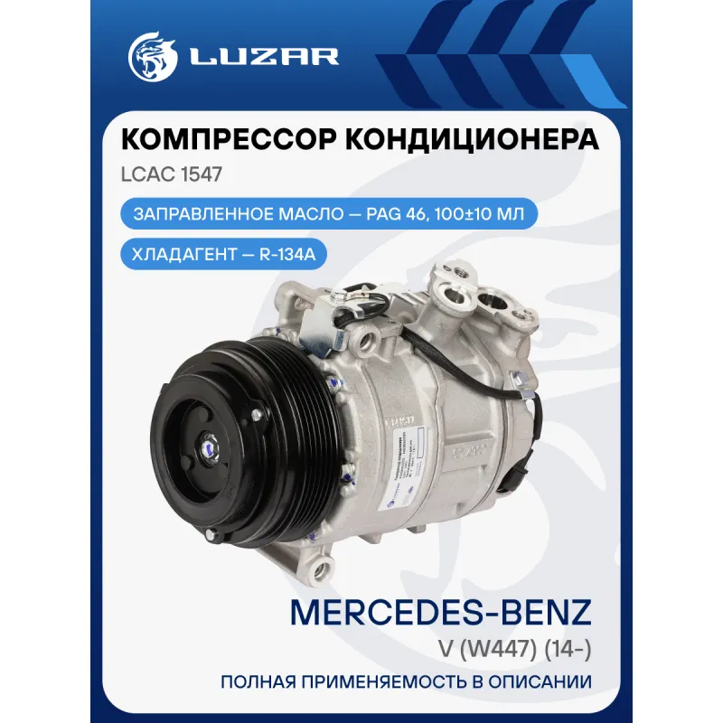 Компрессор кондиционера для автомобилей Mercedes-Benz V (W447) (14-) Характеристики: Артикул: LCAC 1547 OEM номера: A0008303202, A000830320280, A0038302060, A0008303702, 0008303202, 0008303702, 0038302060, A0008307100, 0008307100 Сопутствующий товар: Радиаторы кондиционера (конденсеры): LRAC 1547 Сопутствующий товар: Датчики давления хладагента: LRPS 1550 Количество на автомобиль: 1 Объём заправленного масла, мл: 100±10 Вид хладагента: R134a Тип шкива: 6PK Диаметр шкива, мм: 110 Вид заправленного масла: PAG 46 Ид.№ компрессора: 7SEU17 Мощность, кВт: 3 Подходит для авто: Mercedes-Benz V-Class (W447) (14-), E-class W213 (16-), GLS (X166) (15-), S-Classe W222 C217 (13-) Для проверки применяемости отправьте VIN автомобиля через вкладку "Есть вопросы о товаре?" Комплектация: Компрессор кондиционера Уплотнительные колечки - 2 шт Паспорт изделия Гарантия: от 1 года.