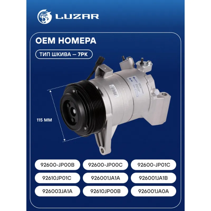 Компрессор кондиционера для автомобилей Nissan Teana (J32) (08-)/Murano (Z51) (08-) Характеристики: Артикул: LCAC 14N9 OEM номера: 92600-JP00B, 92600-JP00C, 92600-JP01C, 92610JP01C, 926001JA1A, 926001JA1B, 926003JA1A, 92610JP00B, 926001JA0A Количество на автомобиль: 1 Объём заправленного масла, мл: 170±10 Вид хладагента: R-134a Тип шкива: 7PK Диаметр шкива, мм: 115 Вид заправленного масла: PAG 46 Ид.№ компрессора: DKS-17D Сопутствующий товар: Радиаторы кондиционера (конденсеры): LRAC 141N9 Сопутствующий товар: Клапаны расширительные кондиционера (ТРВ): LTRV 1408; LTRV 1409 Сопутствующий товар: Муфты компрессоров: LMAC 14N9 Комплектующие компрессора: LMAC 14N9 Сопутствующий товар: Датчики давления хладагента: LRPS 1401 Мощность, кВт: 2,5 Подходит для авто: Nissan Murano II (08-), Teana J32 (08-) Для проверки применяемости отправьте VIN автомобиля через вкладку "Есть вопросы о товаре?" Комплектация: Компрессор кондиционера Паспорт изделия Уплотнительные колечки - 2 шт Гарантия: от 1 года.