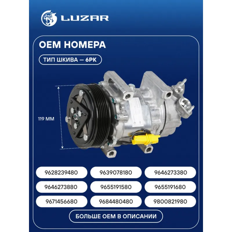 Компрессор кондиционера для автомобилей Peugeot 206 (98-)/307 (00-) 1.4i/1.6i Характеристики: Артикул: LCAC 2026 OEM номера: 6453JP, 6453.KS, 6453.LF, 6453.LH, 6453.LN, 6453.LS, 6453.QF, 6189501960, 6453.GZ, 6453.JL, 6453.QH, 6453FR, 6453JJ, 6453LG, 6453LJ, 6453.QE, 6453QG, 6453XJ, 6453XK, 6453XP, 9628239480, 9639078180, 9646273380, 9646273880, 9655191580, 9655191680, 9671456680, 9684480480, 9800821980, 9800822280 Сопутствующий товар: Радиаторы кондиционера (конденсеры): LRAC 2009, LRAC 20GH, LRAC 2007, LRAC 20GK; Сопутствующий товар: Клапаны расширительные кондиционера (ТРВ): LTRV 2070 Сопутствующий товар: Датчики давления хладагента: LRPS 2080 Комплектующие компрессора: LCP 0902 Количество на автомобиль: 1 Объём заправленного масла, мл: 115±10 Вид хладагента: R-134a Тип шкива: 6PK Диаметр шкива, мм: 119 Вид заправленного масла: PAG 46 Ид.№ компрессора: SD6V12 Мощность, кВт: 2 Подходит для авто: Peugeot 206 (98-), 307 (00-), Partner (96-) Citroen Berlingo I (96-), C2 (03-), C3 (02-) Для проверки применяемости отправьте VIN автомобиля через вкладку "Есть вопросы о товаре?" Комплектация: Компрессор кондиционера Паспорт изделия Уплотнительные колечки - 2 шт Гарантия: от 1 года.