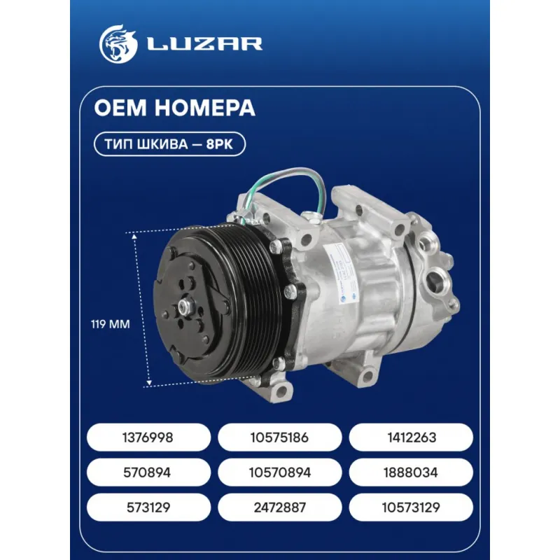 Компрессор кондиционера для автомобилей Scania 4 series (96-)/R-series (04-) Характеристики: Артикул: LCAC 2703 OEM номера: 1376998, 10575186, 1412263, 570894, 10570894, 1888034, 573129, 2472887, 10573129 Количество на автомобиль: 1 Объём заправленного масла, мл: 180±20 Вид хладагента: R-134a Тип шкива: 8PK Диаметр шкива, мм: 119 Вид заправленного масла: PAG 100 Ид.№ компрессора: 7H15 Сопутствующий товар: Радиаторы кондиционера (конденсеры): LRAC 2702 Сопутствующий товар: Ресиверы-осушители: LCR 2701 Мощность, кВт: 2,5 Напряжение, В: 24 Подходит для авто: Scania 4-series (95-), R-serie (04-) Для проверки применяемости отправьте VIN автомобиля через вкладку "Есть вопросы о товаре?" Комплектация: Компрессор кондиционера Паспорт изделия Гарантия: от 1 года.