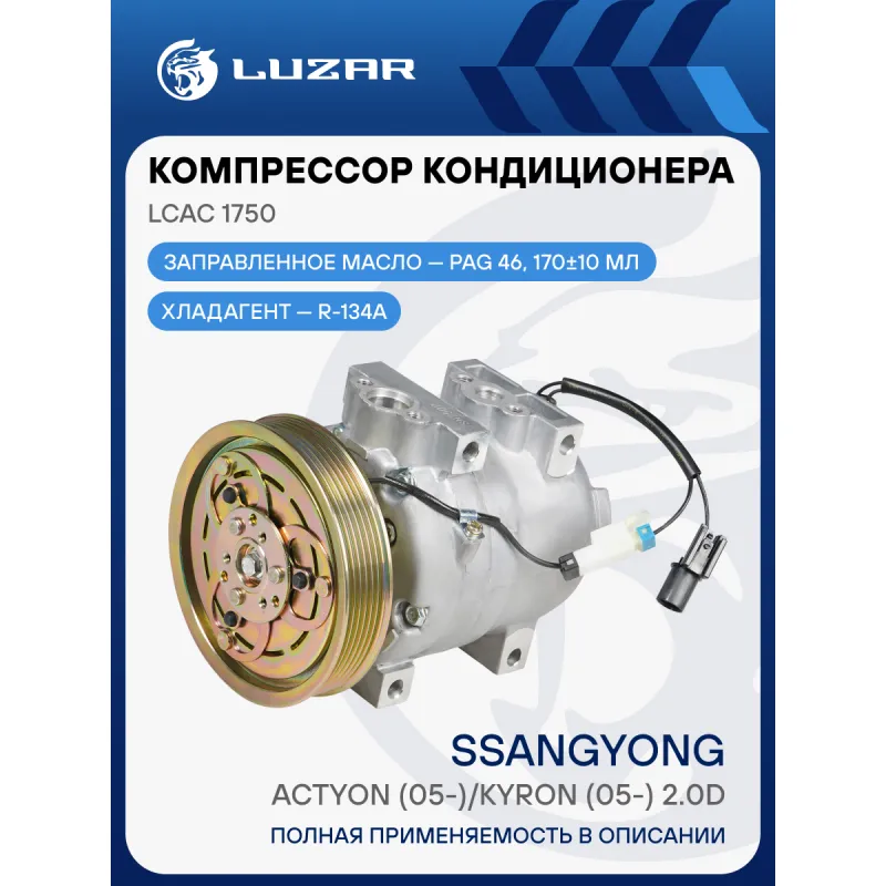 Компрессор кондиционера для автомобилей SsangYong Actyon (05-)/Kyron (05-) 2.0D (тип Valeo) Характеристики: Артикул: LCAC 1750 OEM номера: 6641300015, 6641300115 Сопутствующий товар: Радиаторы кондиционера (конденсеры): LRAC 1750 Количество на автомобиль: 1 Объём заправленного масла, мл: 170±10 Вид хладагента: R134a Тип шкива: 6PK Диаметр шкива, мм: 134 Вид заправленного масла: PAG 46 Ид.№ компрессора: DKV-14C Мощность, кВт: 2,5 Подходит для авто: SsangYong Actyon Sport (05-), Kyron (05-), Actyon (05-) Для проверки применяемости отправьте VIN автомобиля через вкладку "Есть вопросы о товаре?" Комплектация: Компрессор кондиционера Паспорт изделия Гарантия: от 1 года.