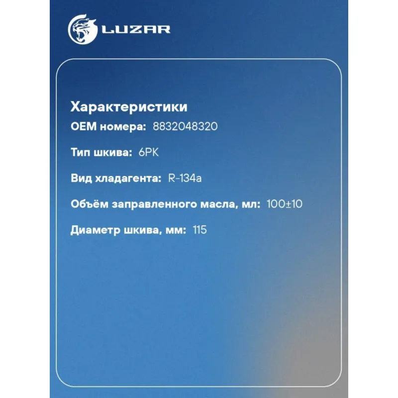 Компрессор кондиционера для автомобилей Toyota Camry (18-) 3.5i Характеристики: Артикул: LCAC 1945 OEM номера: 8832048320 Сопутствующий товар: Радиаторы кондиционера (конденсеры): LRAC 1941 Количество на автомобиль: 1 Объём заправленного масла, мл: 100±10 Вид хладагента: R-134a Тип шкива: 6PK Диаметр шкива, мм: 115 Вид заправленного масла: PAG 46 Ид.№ компрессора: 7SEU17 Мощность, кВт: 3 Подходит для авто: Toyota Camry (18-) Lexus RX IV (15-) Для проверки применяемости отправьте VIN автомобиля через вкладку "Есть вопросы о товаре?" Комплектация: Компрессор кондиционера Уплотнительные кольца - 2 шт Паспорт изделия Гарантия: от 1 года.