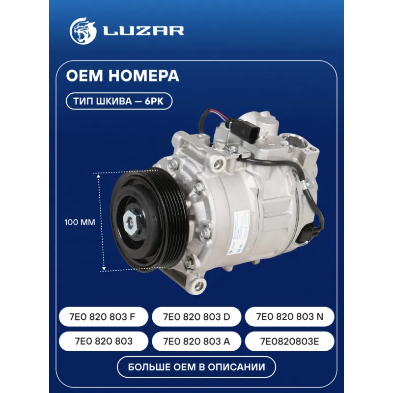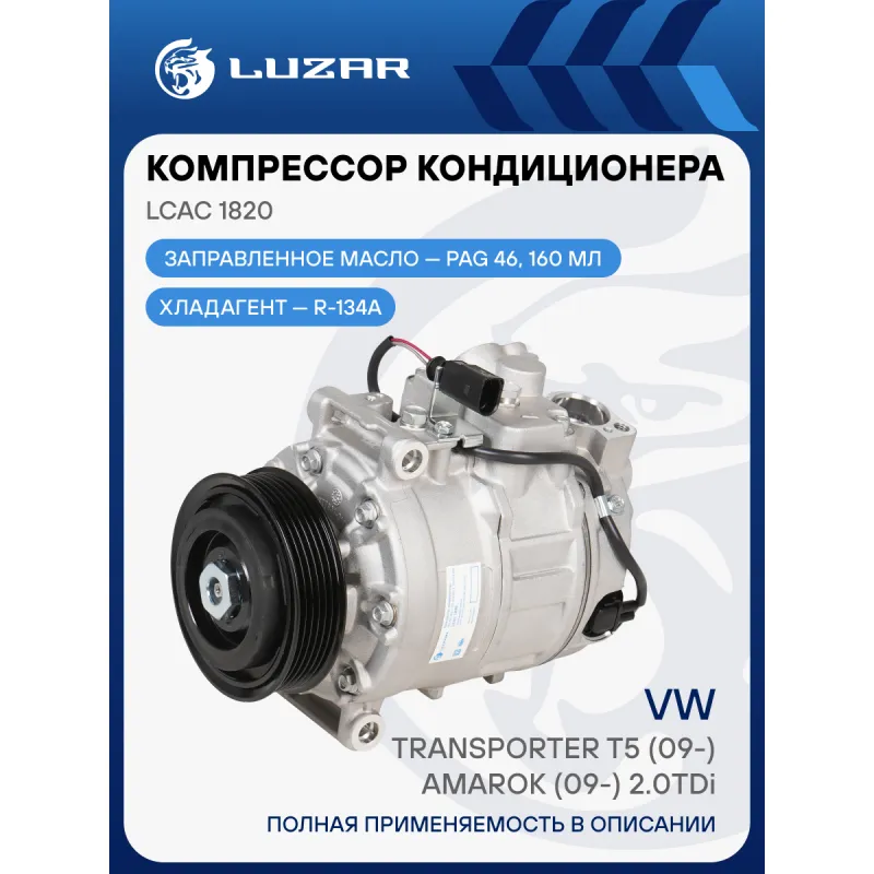 Компрессор кондиционера для автомобилей Transporter T5 (09-)/Amarok (09-) 2.0D Характеристики: Артикул: LCAC 1820 OEM номера: 7E0 820 803 F, 7E0 820 803 D, 7E0 820 803 N, 7E0 820 803, 7E0 820 803 A, 7E0820803E, 7E0 820 803 G Сопутствующий товар: Датчики давления хладагента: LRPS 1801 Комплектующие компрессора: LCC 1808, LCH 1808, Только для компрессоров начиная с партии 11.12.2023 Количество на автомобиль: 1 Подходящий разъем AIRLINE:: AECC126 Объём заправленного масла, мл: 160 Вид хладагента: R134a Тип шкива: 6PK Диаметр шкива, мм: 100 Вид заправленного масла: PAG 46 Ид.№ компрессора: 7SEU17C Сопутствующий товар: Радиаторы кондиционера (конденсеры): LRAC 1805; LRAC 1820 Сопутствующий товар: Клапаны расширительные кондиционера (ТРВ): LTRV 1825; LTRV 1858 Сопутствующий товар: Ресиверы-осушители: LCD 1806; LCD 1808 Мощность, кВт: 2,5 Подходит для авто: Volkswagen Amarok (09-), Transporter T5 (03-), Multivan (03-), Transporter T6 (15-), Multivan T6 (15-) Для проверки применяемости отправьте VIN автомобиля через вкладку "Есть вопросы о товаре?" Комплектация: Компрессор кондиционера Паспорт изделия Гарантия: от 1 года.