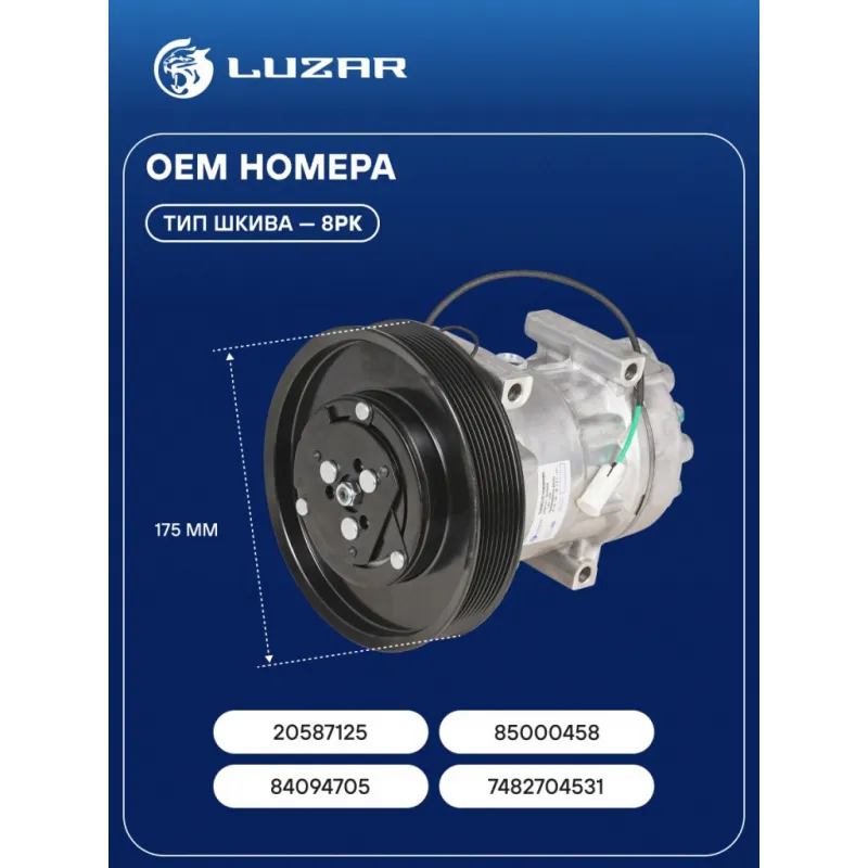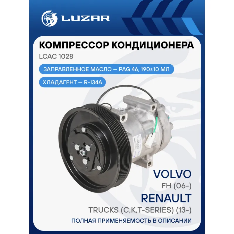 Компрессор кондиционера для автомобилей Volvo FH (06-)/Renault Trucks (C,K,T-series) (13-) Характеристики: Артикул: LCAC 1028 OEM номера: 20587125, 85000458, 84094705, 7482704531 Количество на автомобиль: 1 Объём заправленного масла, мл: 190±10 Вид хладагента: R-134a Тип шкива: 8PK Диаметр шкива, мм: 175 Вид заправленного масла: PAG 46 Ид.№ компрессора: SD7H15 Сопутствующий товар: Радиаторы кондиционера (конденсеры): LRAC 1074, LRAC 1071 Сопутствующий товар: Ресиверы-осушители: LCR 1009, LCR 1020 Мощность, кВт: 2,5 Напряжение, В: 24 V Подходит для авто: RENAULT TRUCKS C-SERIE (13-), K-SERIE (13-), T-SERIE (13-) Volvo FM (05-), FH (05-) Для проверки применяемости отправьте VIN автомобиля через вкладку "Есть вопросы о товаре?" Комплектация: Компрессор кондиционера Паспорт изделия Гарантия: от 1 года.