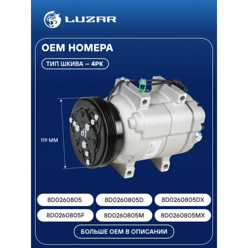 Компрессор кондиционера для автомобилей VW Passat B5 (96-)/Audi A4 (B5) (94-) Характеристики: Артикул: LCAC 1885 OEM номера: 8D0260805, 8D0260805D, 8D0260805DX, 8D0260805F, 8D0260805M, 8D0260805MX, 8D0260811A Сопутствующий товар: Датчики давления хладагента: LRPS 1807 Количество на автомобиль: 1 Объём заправленного масла, мл: 180±10 Вид хладагента: R-134a Тип шкива: 4PK Диаметр шкива, мм: 119 Вид заправленного масла: PAG 46 Ид.№ компрессора: DCW17 Сопутствующий товар: Радиаторы кондиционера (конденсеры): LRAC 1812 Сопутствующий товар: Ресиверы-осушители: LCR 1806 Мощность, кВт: 2,5 Подходит для авто: Audi A4 B8 (07-), A5 (07-), Q5 (08-) Для проверки применяемости отправьте VIN автомобиля через вкладку "Есть вопросы о товаре?" Комплектация: Компрессор кондиционера Уплотнительные кольца - 2 шт Паспорт изделия Гарантия: от 1 года.