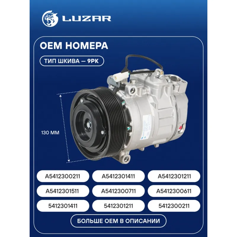 Компрессор кондиционера Mercedes-Benz Actros MP2 (02-) Характеристики: Артикул: LCAC 1541 OEM номера: A5412300211, A5412301411, A5412301211, A5412301511, A5412300711, A5412300611, 5412301411, 5412301211, 5412300211, 5412300611, 5412300711, 5412301511 Количество на автомобиль: 1 Объём заправленного масла, мл: 180±10 Вид хладагента: R-134a Тип шкива: 9PK Диаметр шкива, мм: 130 Вид заправленного масла: PAG 46 Ид.№ компрессора: 7SBU16C Сопутствующий товар: Радиаторы кондиционера (конденсеры): LRAC 1570 Сопутствующий товар: Клапаны расширительные кондиционера (ТРВ): LTRV 1550 Мощность, кВт: 2,5 Напряжение, В: 24 V Подходит для авто: Mercedes-Benz Actros (96-), Actros (03-) Для проверки применяемости отправьте VIN автомобиля через вкладку "Есть вопросы о товаре?" Комплектация: Компрессор кондиционера Паспорт изделия Гарантия: от 1 года.