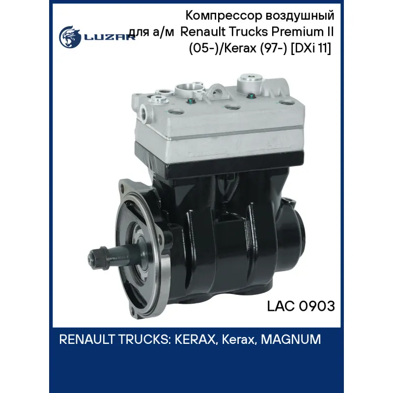Компрессор воздушный для а/м Renault Trucks Premium II (05-)/Kerax (97-) [DXi 11] (2 цилиндра, 636 см3) Характеристики: Артикул: LAC 0903 OEM номера: 20846000, 22016995, 20774294, 85013935, 85155727, 7422062019, 7485013936 Номинальный рабочий объем, см3: 636 Номинальная частота вращения коленчатого вала, об/мин: 2500 Потребляемая мощность, кВт: 4,5 Производительность не менее, л/мин: >450 (27 м3/ч) Выброс масла с нагнетаемым воздухом не более, г/час: 1 Система смазки: под давлением от системы смазки двигателя Система охлаждения: жидкостная от системы охлаждения двигателя Количество на автомобиль: 1 Комплектация: Компрессор воздушный - 1 шт Гарантия: от 1 года.