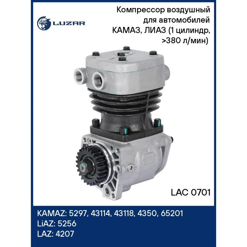 Компрессор воздушный для автомобилей КАМАЗ, ЛИАЗ (1 цилиндр, >380 л/мин) (до 2011г.) Характеристики: Артикул: LAC 0701 OEM номера: 183509015, 532053509015 Номинальный рабочий объем, см3: 306 Номинальная частота вращения коленчатого вала, об/мин: 3000 Потребляемая мощность, кВт: 4,5 Производительность не менее, л/мин: 380 (27 м3/ч) Выброс масла с нагнетаемым воздухом не более, г/час: 1 Количество на автомобиль: 1 Система смазки: под давлением от системы смазки двигателя Система охлаждения: жидкостная от системы охлаждения двигателя Подходит для авто: КамаАЗ 5297, 43114, 43118, 4350, 65201, 53229, 65115, 4325, 4326, 43261, 43501, 5360, 4350, 5350, 65115, 4326, 5360, 5460, 6460, 65116, 6520, 6522, 6540 ЛиАЗ 5256 ЛАЗ 4207 Для проверки применяемости отправьте VIN автомобиля через вкладку "Есть вопросы о товаре?" Комплектация: Компрессор воздушный - 1 шт Гарантия: от 1 года.