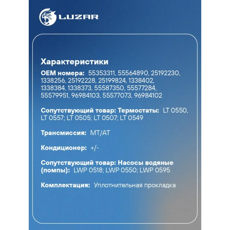 | Сопутствующий товар: Насосы водяные (помпы) | LWP 0518; LWP 0550; LWP 0595 |