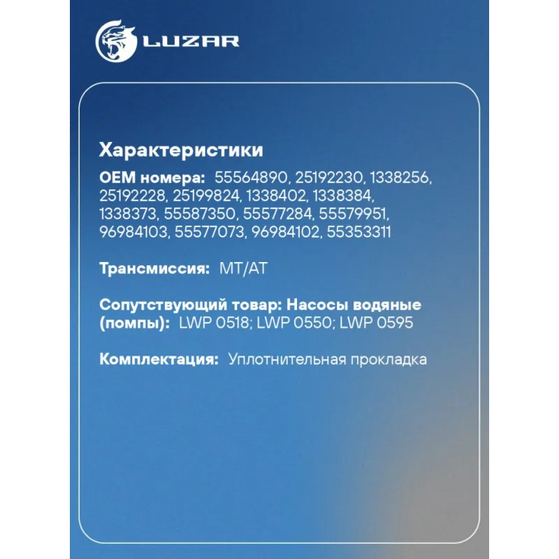 | Сопутствующий товар: Насосы водяные (помпы) | LWP 0518; LWP 0550; LWP 0595 |