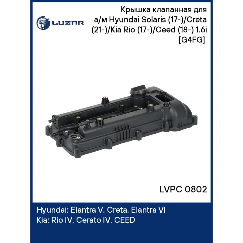Крышка клапанная для а/м Hyundai Solaris (17-)/Creta (21-)/Kia Rio (17-)/Ceed (18-) 1.6i [G4FG] (пластик., с прокл.) Характеристики: Артикул: LVPC 0802 OEM номера: 224102B810, 22410-2B830, 224102B800 Сопутствующие товары: прокладка клапанной крышки: LES 20802 Количество на автомобиль: 1 Материал клапанной крышки: PA66-GF35 Материал прокладки: ACM Подходит для авто: Hyundai Creta (16-), Elantra V (11-), Elantra VI (15-) Kia Rio IV (17-), Cerato IV (18-), CEED (18-) Для проверки применяемости отправьте VIN автомобиля через вкладку "Есть вопросы о товаре?" Комплектация: Крышка - 1 шт Прокладка - 1 шт Гарантия: от 1 года.