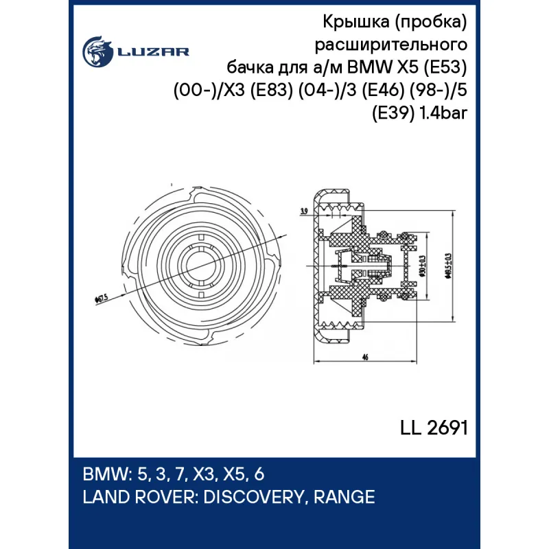 Крышка (пробка) расширительного бачка для а/м BMW X5 (E53) (00-)/X3 (E83) (04-)/3 (E46) (98-)/5 (E39) (95-) 1.4bar Характеристики: Артикул: LL 2691 OEM номера: 17137639023, 17111742232, 17111719167, 17112242256, 17114379048, PCD000070 Давление, БАР: 1.4 (140кПа) Сопутствующий товар: Радиаторы охлаждения: LRc 26108; LRc 26118 Соп... Читать полностью →