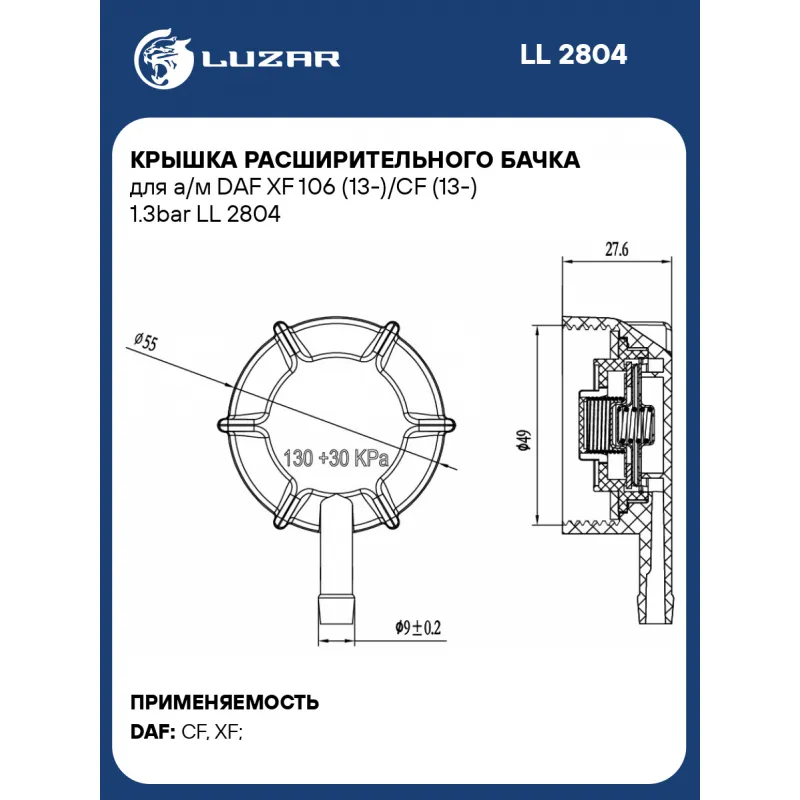 Крышка расширительного бачка для а/м DAF XF 106 (13-)/CF (13-) 1.3bar Характеристики: Артикул: LL 2804 OEM номера: 1813201 Давление, БАР: 1.3 (130кПа) Сопутствующий товар: Радиаторы охлаждения: LRc 2809 Сопутствующий товар: Бачки расширительные: LET 2801 Количество на автомобиль: 1 Трансмиссия: MT/AT Кондиционер: +/- Материал: п... Читать полностью →