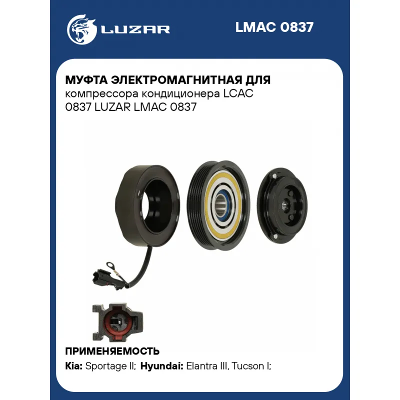 Муфта электромагнитная для компрессора кондиционера LCAC 0837 LUZAR Характеристики: Артикул: LMAC 0837 OEM номера: LCAC 0837 Тип шкива: 6PK Диаметр шкива: 128 Сопутствующий товар:: LCAC 0837 Количество на автомобиль: 1 Напряжение, В: 12 Ограничение производителя: LUZAR Ид.№ компрессора: HS-18 Совместимость с компрессорами LUZAR: Совместим с LCAC 0837 Подходит для авто: Kia Sportage II (04-) Hyundai Elantra III (00-), Tucson I (04-), Santa Fe (00-), Sonata IV (EF) (98-) Для проверки применяемости отправьте VIN автомобиля через вкладку "Есть вопросы о товаре?" Комплектация: Катушка электромагнитная - 1 шт Шкив с подшипником - 1 шт Прижимная пластина - 1 шт Гарантия: от 1 года.
