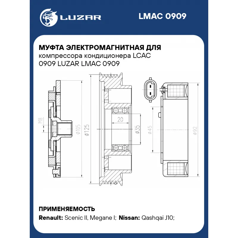 Муфта электромагнитная для компрессора кондиционера LCAC 0909 LUZAR Характеристики: Артикул: LMAC 0909 OEM номера: LCAC 0909 Тип шкива: 6PK Диаметр шкива: 125 Сопутствующий товар:: LCAC 0909 Количество на автомобиль: 1 Напряжение, В: 12 Ограничение производителя: LUZAR Ид.№ компрессора: CVC Совместимость с компрессорами LUZAR: Совместим с LCAC 0909 Подходит для авто: Renault Scenic II (04-), Megane I (95-), Megane II (02-), Megane Scenic II (03-), Megane Scenic II (03-) Nissan Qashqai J10 (06-) Для проверки применяемости отправьте VIN автомобиля через вкладку "Есть вопросы о товаре?" Комплектация: Катушка электромагнитная - 1 шт Шкив с подшипником - 1 шт Прижимная пластина - 1 шт Гарантия: от 1 года.