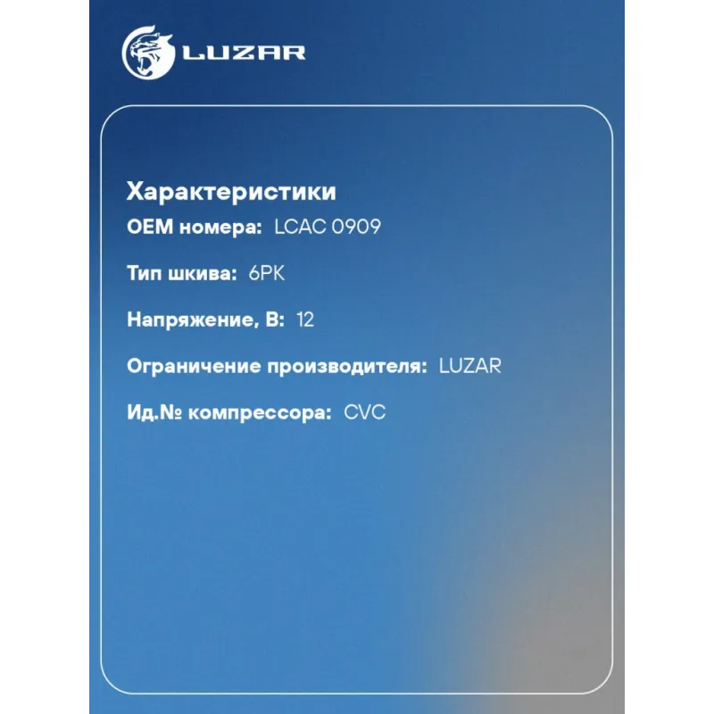 | Совместимость с компрессорами LUZAR | Совместим с LCAC 0909 |