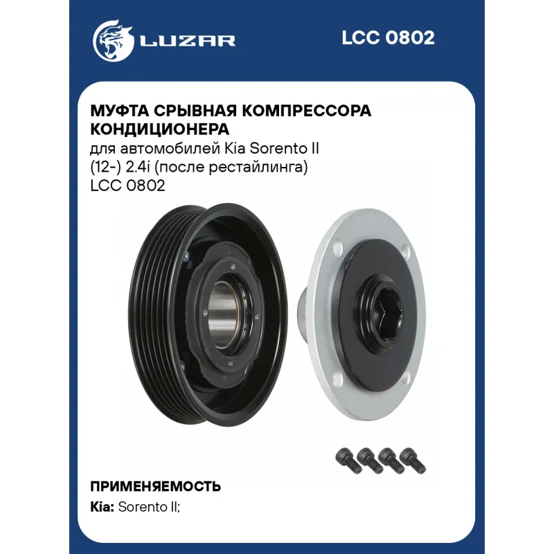 Муфта срывная компрессора кондиционера для автомобилей Kia Sorento II (12-) 2.4i (после рестайлинга) LCC 0802 LUZAR
