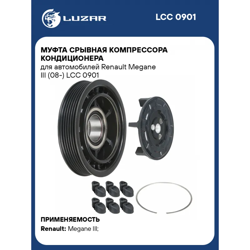 Муфта срывная компрессора кондиционера для автомобилей Renault Megane III (08-) Характеристики: Артикул: LCC 0901 OEM номера: 8200939386 Тип шкива: 6PK Диаметр шкива: 125 Количество на автомобиль: 1 Ограничение производителя: Denso Ид.№ компрессора: 6SEL14C Совместимость с компрессорами LUZAR: Несовместим Совместим с компрессорами кондиционера: 8200939386 Подходит для авто: Renault Megane III (08-), Megane Scenic III (08-) Для проверки применяемости отправьте VIN автомобиля через вкладку "Есть вопросы о товаре?" Комплектация: Пластина срывная - 1 шт Шкив с подшипником - 1 шт Комплект резиновых демпферов - 1 шт Гарантия: от 1 года.