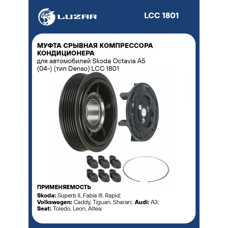 Муфта срывная компрессора кондиционера для автомобилей Skoda Octavia A5 (04-) (тип Denso) Характеристики: Артикул: LCC 1801 OEM номера: 1K0820859SX, 1K0820859T, 1K0820808A, 1K0820803F, 1K0820803P, 1K0820859S, 1K0820859P, 1K0820859H, 1K0820859M, 1K0820859C, 1K0820859E, 1K0820812B Тип шкива: 6PK Диаметр шкива: 110 Количество на автомобиль: 1 Ограничение производителя: Denso Ид.№ компрессора: 7SEU17C Совместимость с компрессорами LUZAR: Несовместим Совместим с компрессорами кондиционера: 1K0820803F, 1K0820803P, 1K0820808A, 1K0820812B, 1K0820859C, 1K0820859E, 1K0820859H, 1K0820859M, 1K0820859P, 1K0820859S, 1K0820859SX Подходит для авто: Skoda Superb II (08-), Fabia III (14-), Rapid (20-), Rapid (12-), Fabia II (07-), Octavia A5 (04-), Yeti (09-), Octavia A7 (13-) Volkswagen Caddy (04-), Tiguan (08-), Sharan (10-), Jetta (11-), Polo (RUS) (20-), Golf V (03-), Golf VI (08-), Jetta (05-), Passat B6 (05-), Caddy (04-), Eos (06-), Touran (03-), CC (11-), CC (08-), Golf VII (12-), Tiguan (16-) Audi A3 (07-), A3 (03-) Seat Toledo (04-), Leon (05-), Altea (04-), Toledo (12-) Для проверки применяемости отправьте VIN автомобиля через вкладку "Есть вопросы о товаре?" Комплектация: Шкив с подшипником - 1 шт Пластина срывная - 1 шт Комплект резиновых демпферов - 1 шт Гарантия: от 1 года.
