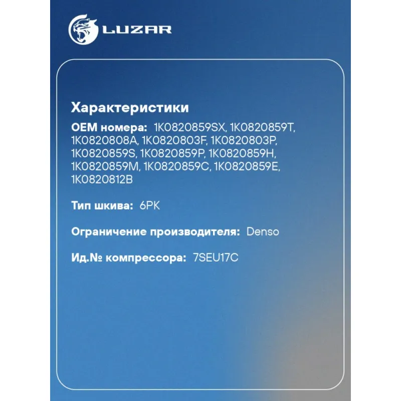 | Совместим с компрессорами кондиционера | 1K0820803F, 1K0820803P, 1K0820808A, 1K0820812B, 1K0820859C, 1K0820859E, 1K0820859H, 1K0820859M, 1K0820859P, 1K0820859S, 1K0820859SX |