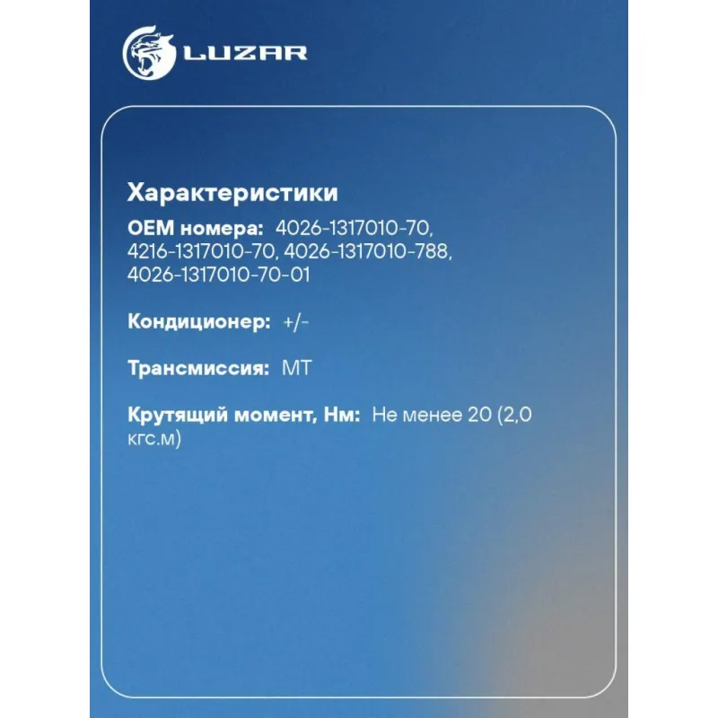 Муфта вентилятора электромагнитная для автомобилей ГАЗель-Бизнес (поликлин.) Характеристики: Артикул: LEC 03218 OEM номера: 4026-1317010-70, 4216-1317010-70, 4026-1317010-788, 4026-1317010-70-01 Количество на автомобиль: 1 Трансмиссия: MT Кондиционер: +/- Напряжение: 12В Крутящий момент, Нм: не менее 20 (2,0 кгс.м) Подходит для авто: ГАЗ 33027, Gazelle-Business, 33025 Для проверки применяемости отправьте VIN автомобиля через вкладку "Есть вопросы о товаре?" Комплектация: Электромагнитная муфта - 1 шт Гарантия: от 1 года.