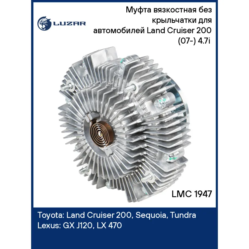 Муфта вязкостная без крыльчатки для автомобилей Land Cruiser 200 (07-) 4.7i (без крыльчатки) Характеристики: Артикул: LMC 1947 OEM номера: 1621050101, 1621050102, 1621050100 Трансмиссия: AT Кондиционер: + Температура включения, °С: 80±10 Температура выключения, °С: 50±15 Количество на автомобиль: 1 Двигатель: [2UZ-FE] Диаметр муфты, мм.: 168 Вид эксплуатации: термический Подходит для авто: Toyota Land Cruiser 200 (07-), Sequoia (01-), Tundra (00-), 4Runner (03-) Lexus GX J120 (02-), LX 470 (98-) Для проверки применяемости отправьте VIN автомобиля через вкладку "Есть вопросы о товаре?" Комплектация: Муфта вязкостная - 1 шт Гарантия: от 1 года.