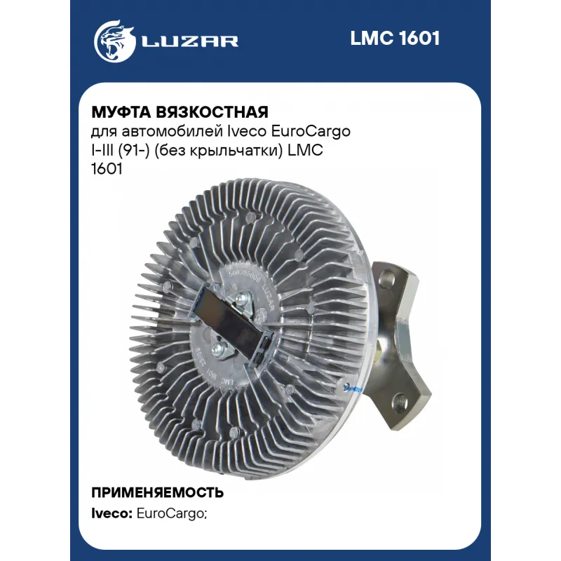 Муфта вязкостная для автомобилей Iveco EuroCargo I-III (91-) (без крыльчатки) Характеристики: Артикул: LMC 1601 OEM номера: 500395009, 500392864 Температура включения, °С: 75 Температура выключения, °С: 55 Количество на автомобиль: 1 Трансмиссия: MT Кондиционер: +/- Диаметр муфты, мм.: 167,6 Вид эксплуатации: термический Подходит для авто: Iveco EuroCargo (00-) Для проверки применяемости отправьте VIN автомобиля через вкладку "Есть вопросы о товаре?" Комплектация: Муфта вязкостная - 1 шт Паспорт изделия - 1 шт Гарантия: от 1 года.