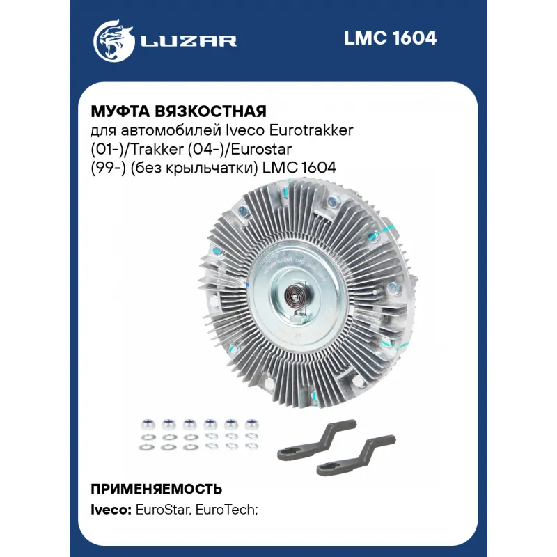 Муфта вязкостная для автомобилей Iveco Eurotrakker (01-)/Trakker (04-)/Eurostar (99-) (без крыльчатки) Характеристики: Артикул: LMC 1604 OEM номера: 41210010, 41213991 Температура включения, °С: 75 Температура выключения, °С: 55 Количество на автомобиль: 1 Трансмиссия: MT Кондиционер: +/- Диаметр муфты, мм.: 240 Вид эксплуатации: термический Подходит для авто: Iveco EuroStar (93-), EuroTech (98-), EuroTrakker (99-), Trakker (04-), Trakker (12-) Для проверки применяемости отправьте VIN автомобиля через вкладку "Есть вопросы о товаре?" Комплектация: Муфта вязкостная - 1 шт Паспорт изделия - 1 шт Болты - 6 шт Скобы - 2 шт Гайки - 6 шт Шайба - 6 шт Стопорные колечки - 6 шт Гарантия: от 1 года.