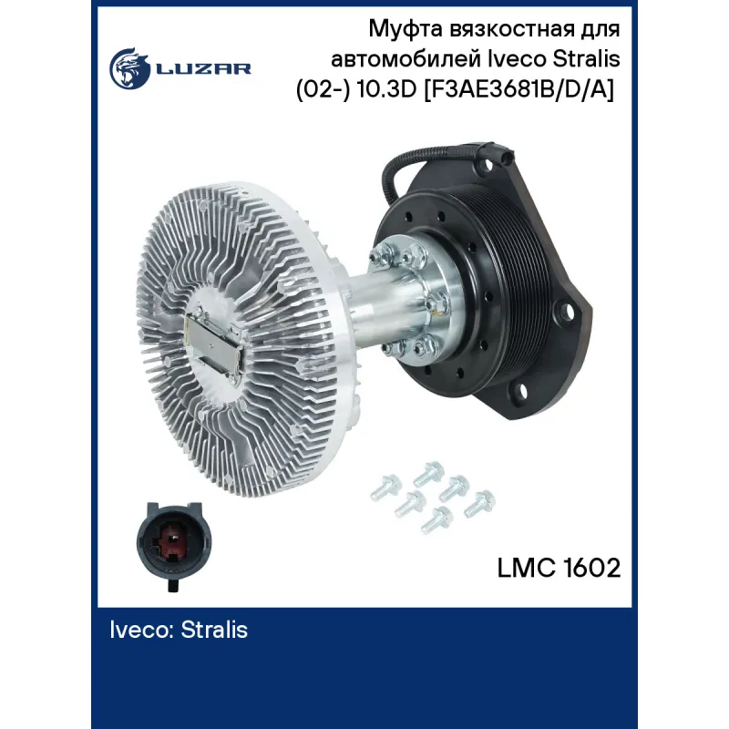 Муфта вязкостная для автомобилей Iveco Stralis (02-) 10.3D [F3AE3681B/D/A] (с электромагнитной муфтой, без крыльчатки) Характеристики: Артикул: LMC 1602 OEM номера: 504236556, 5801587048, 5801687224 Температура включения, °С: 60±5 Температура выключения, °С: 35±5 Количество на автомобиль: 1 Диаметр муфты, мм.: 233 Вид эксплуатации: термический Конструкция: в сборе с электромагнитной муфтой, вылет до крыльчатки - 218,3 мм. Примечание: является адаптацией оригинального изделия, при замене требуется заглушить воздушную магистраль. Двигатель: [F3AE3681B/D/A] Подходит для авто: Iveco Stralis (03-) Для проверки применяемости отправьте VIN автомобиля через вкладку "Есть вопросы о товаре?" Комплектация: Муфта вязкостная - 1 шт Гарантия: от 1 года.