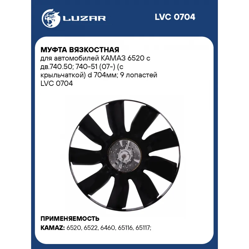 Муфта вязкостная для автомобилей КАМАЗ 6520 с дв.740.50; 740-51 (07-) (с крыльчаткой) d 704мм; 9 лопастей Характеристики: Артикул: LVC 0704 OEM номера: 20002748, 45104-1308006-90, 020002749, 020002750 Температура включения, °С: 68 Температура выключения, °С: 48 Количество на автомобиль: 1 Трансмиссия: MT Кондиционер: - Диаметр крыльчатки, мм: 704 Диаметр муфты, мм.: 185 Вид эксплуатации: термический Подходит для авто: КамаАЗ 6520, 6522, 6460, 65116, 65117, 65225 Для проверки применяемости отправьте VIN автомобиля через вкладку "Есть вопросы о товаре?" Комплектация: Муфта вязкостная в сборе с крыльчаткой - 1 шт Паспорт изделия - 1 шт Шпилька - 6 шт Гайка - 6 шт Шайба - 12 шт Гарантия: от 1 года.