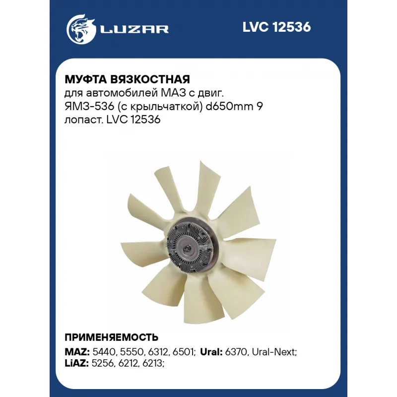 Муфта вязкостная для автомобилей МАЗ с двиг. ЯМЗ-536 (с крыльчаткой) d650mm 9 лопаст. Характеристики: Артикул: LVC 12536 OEM номера: 536.1308010-03, 5361308010, 020004782 Температура включения, °С: 70 Температура выключения, °С: 55 Количество на автомобиль: 1 Трансмиссия: MT Кондиционер: - Диаметр крыльчатки, мм: 650 Вид эксплуатации: термический Подходит для авто: МАЗ 5440, 5550, 6312, 6501 Ural 6370, Ural-Next ЛиАЗ 5256, 6212, 6213 Для проверки применяемости отправьте VIN автомобиля через вкладку "Есть вопросы о товаре?" Комплектация: Муфта вязкостная в сборе с крыльчаткой - 1 шт Паспорт изделия - 1 шт Шпилька - 6 шт Гайка - 6 шт Шайба - 6 шт Гарантия: от 1 года.
