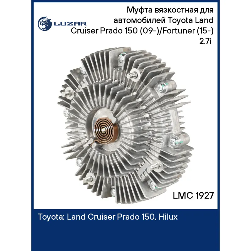 Муфта вязкостная для автомобилей Toyota Land Cruiser Prado 150 (09-)/Fortuner (15-) 2.7i (без крыльчатки) Характеристики: Артикул: LMC 1927 OEM номера: 1621075100, 162100C010 Трансмиссия: MT/AT Кондиционер: + Сопутствующий товар: Насосы водяные (помпы): LWP 1914 Температура включения, °С: 80±10 Температура выключения, °С: 50±15 Количество на автомобиль: 1 Двигатель: [2TR-FE] Диаметр муфты, мм.: 168 Вид эксплуатации: термический Подходит для авто: Toyota Land Cruiser Prado 150 (09-), Hilux (05-), Fortuner (15-), Hilux (15-) Для проверки применяемости отправьте VIN автомобиля через вкладку "Есть вопросы о товаре?" Комплектация: Муфта вязкостная - 1 шт Гарантия: от 1 года.