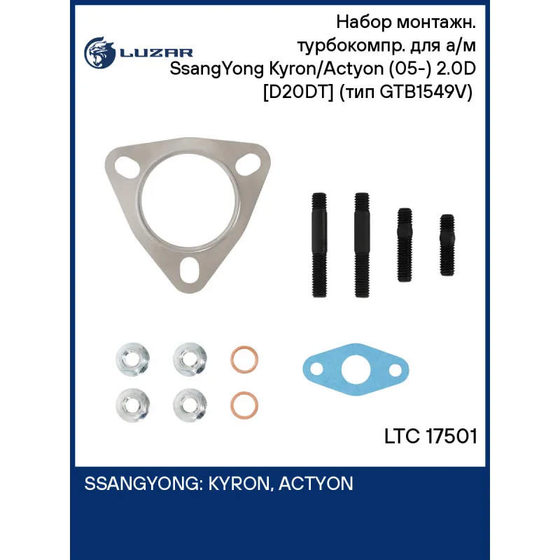 Набор монтажн. турбокомпр. для а/м SsangYong Kyron/Actyon (05-) 2.0D [D20DT] (тип GTB1549V) (прокл.,шпил.,гайк.) Характеристики: Артикул: LTC 17501 OEM номера: 6640900780, 6640900880, A6640900780 Количество на автомобиль: 1 Материал: Сталь, медь, безасбестовый картон Сопутствующий товар: Турбокомпрессор: LAT 1750 Сопутствующий т... Читать полностью →