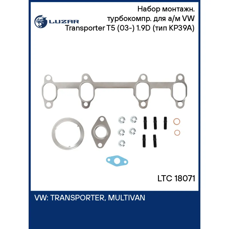 Набор монтажн. турбокомпр. для а/м VW Transporter T5 (03-) 1.9D (тип KP39A) (прокл.,шпил.,гайк.) Характеристики: Артикул: LTC 18071 OEM номера: 038253010C, 038253010N, 038253014H, 038253019J, 038253056M Количество на автомобиль: 1 Материал: Сталь, медь, безасбестовый картон Сопутствующий товар: Турбокомпрессор: LAT 1807 Сопутств... Читать полностью →