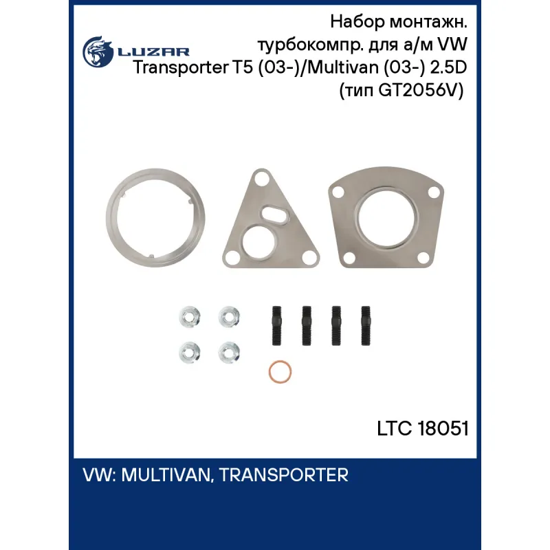 Набор монтажн. турбокомпр. для а/м VW Transporter T5 (03-)/Multivan (03-) 2.5D (тип GT2056V) (прокл.,шпил.,гайк.) Характеристики: Артикул: LTC 18051 OEM номера: 070145701H, 070145702A, 070145702AX Количество на автомобиль: 1 Материал: Сталь, медь, безасбестовый картон Сопутствующий товар: Турбокомпрессор: LAT 1805 Сопутствующий ... Читать полностью →