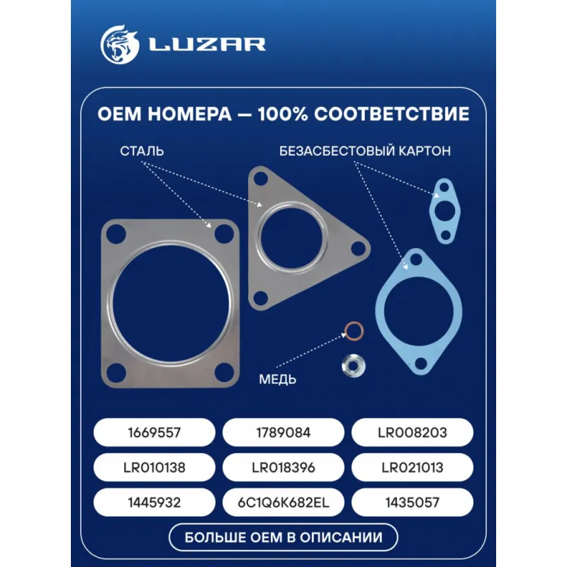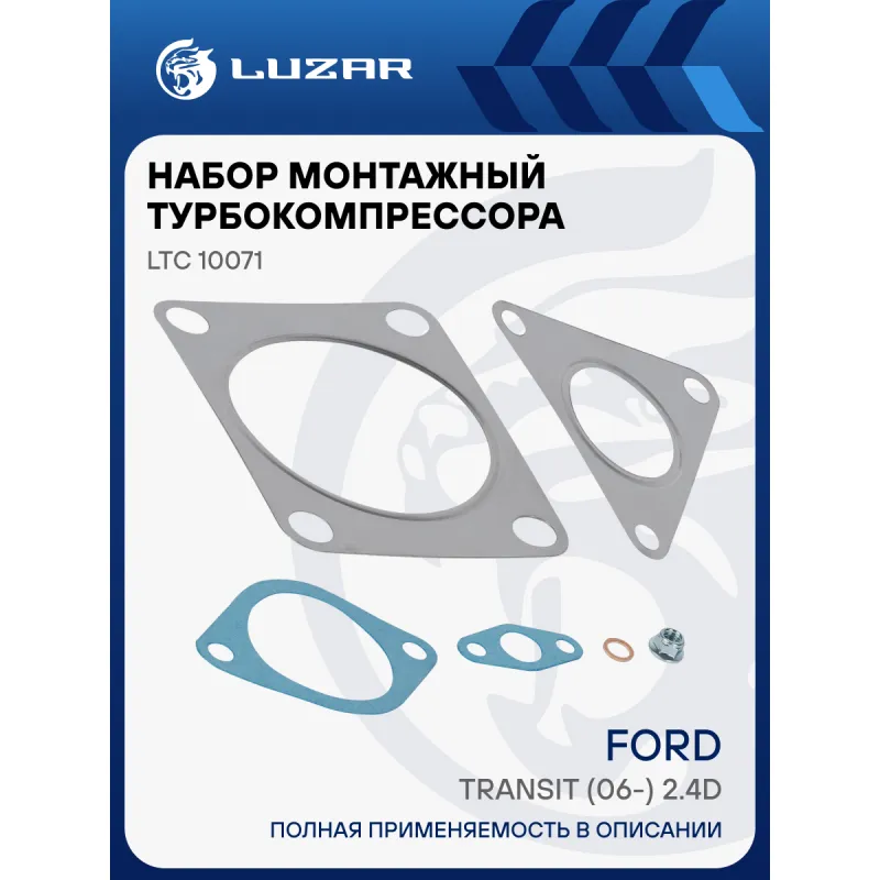 Набор монтажн. турбокомпр. для а/м Ford Transit (06-) 2.4D (тип GT2052V) (прокл.5 шт.,шпил.1 шт.,гайк.1 шт.) Характеристики: Артикул: LTC 10071 OEM номера: 1669557, 1789084, 6C1Q 6K682 E1N, 6C1Q6K682EF, 6C1Q6K682EH, 1445932, 1435057, 6C1Q6K682EL, LR008203, LR010138, LR018396, LR021013 Количество на автомобиль: 1 Материал: Сталь, медь, безасбестовый картон Сопутствующий товар: Турбокомпрессор: LAT 1007 Сопутствующий товар: Актуатор: LTC 1007e Подходит для авто: Land Rover Defender (06-) Ford Transit VII (06-) Для проверки применяемости отправьте VIN автомобиля через вкладку "Есть вопросы о товаре?" Комплектация: Прокладка медная - 1 шт Прокладка картонная безасбестовая - 2 шт Прокладка стальная - 2 шт Шпилька - 1 шт Гайка - 1 шт Гарантия: от 1 года.