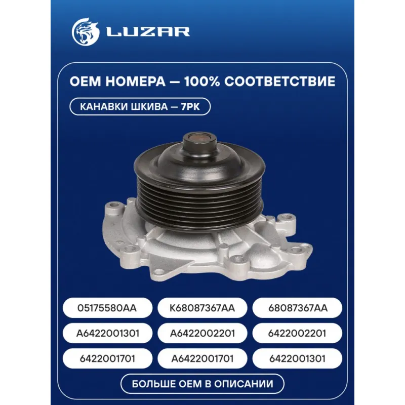 Насос водяной для автомобилей Mercedes-Benz ML (W164) (05-)/S (W221) (05-)/E (W211) (02-) 3.0D [OM642] (7PK) Характеристики: Артикул: LWP 15320 OEM номера: 05175580AA, K68087367AA, 68087367AA, A642200220180, A6422002201, 6422002201, 6422001701, A6422001701, 6422001301, A6422001301 Трансмиссия: MT/AT Материал крыльчатки: Листовая сталь Кондиционер: +/- Сопутствующий товар: Термостаты: LT 15642; LT 15651; LT 1580 Количество канавок шкива, шт.: 7PK Подходит для авто: Mercedes-Benz C-Class W204 (07-), E-Class W211 (02-), E-Class W212 (09-), GL-Class I (X164) (06-), M-Class II (W164) (05-), S-Class W221 (05-) Jeep Grand Cherokee (10-) Для проверки применяемости отправьте VIN автомобиля через вкладку "Есть вопросы о товаре?" Комплектация: Насос водяной Уплотнительная прокладка Паспорт изделия Гарантия: от 1 года.
