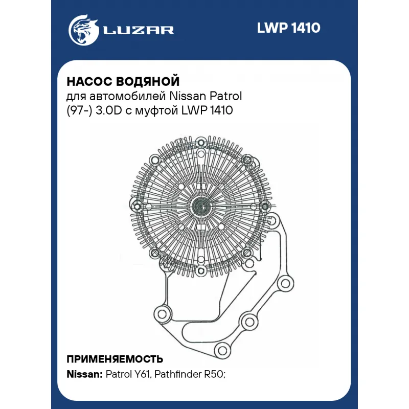 Насос водяной для автомобилей Nissan Patrol (97-) 3.0D с муфтой Характеристики: Артикул: LWP 1410 OEM номера: 210102W20A, 210102W225, 210102W226, 210102W227, 210102W228, 21010VG126, 21010VG127, 21010VG128, B10102W20A, B1010-VG128 Материал прокладки: Сталь Подходит для авто: Nissan Patrol Y61 (97-), Pathfinder R50 (95-), Terrano R50 (95-) Для проверки применяемости отправьте VIN автомобиля через вкладку "Есть вопросы о товаре?" Комплектация: Насос водяной Уплотнительная прокладка Паспорт изделия Гарантия: от 1 года.