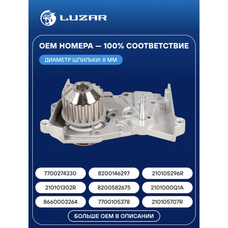 Насос водяной (TURBO) для автомобилей Лада Largus (10-)/Renault Logan 16V/8V (шпилька D 8мм) Характеристики: Артикул: LWP 0931 OEM номера: 210101302R, 8200582675, 2101000Q1A, 2101000Q3C, 2101000Q0F, 2101000QAA, 2101000Q0D, 7700274330, 8200146297, 210105296R, 8660003264, 7700105378, 210105707R, 8200428447, 8671019641, 7700105176, 210100753R, 8200962184 Трансмиссия: MT/AT Кондиционер: +/- Сопутствующий товар: Насосы водяные (помпы): LWP 0930 Материал крыльчатки: Керамический пластик PPS Сопутствующий товар: Термостаты: LT 0822; LT 0901; LT 0902; LT 0914; LT 0915; LT 0916 Аналог: LWP 0930 Особенности конструкции:: Помпа с увеличеной производительностью, отличается от LWP 0930 крыльчаткой. Двигатель: [K4M; K7M; K4J] Дополнительная информация: Использовать прокладку только из комплекта! Диаметр шпильки: 8 мм. Подходит для авто: Renault Kangoo (97-), Fluence (10-), Logan (04-), Clio II (98-), Clio Symbol (01-), Symbol (01-), Megane I (95-), Megane Scenic I (96-), Duster (10-), Megane II (02-), Megane Scenic II (03-) Dacia Duster (10-) ВАЗ Largus (12-) Для проверки применяемости отправьте VIN автомобиля через вкладку "Есть вопросы о товаре?" Комплектация: Паспорт изделия Насос водяной Уплотнительная прокладка Гарантия: от 1 года.