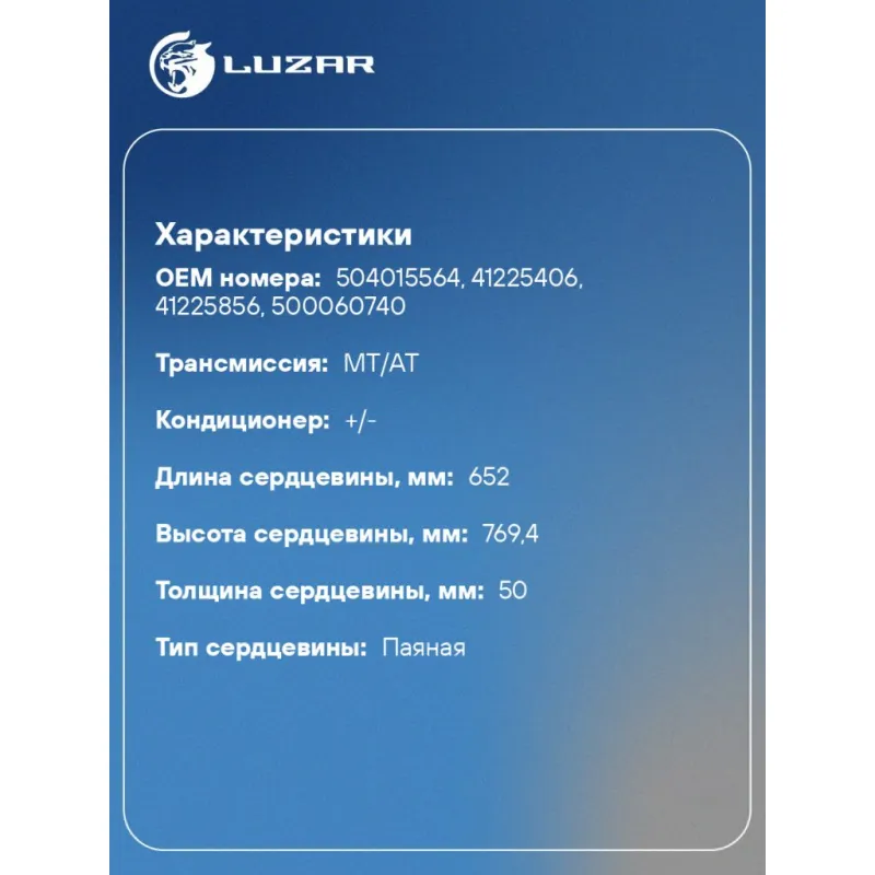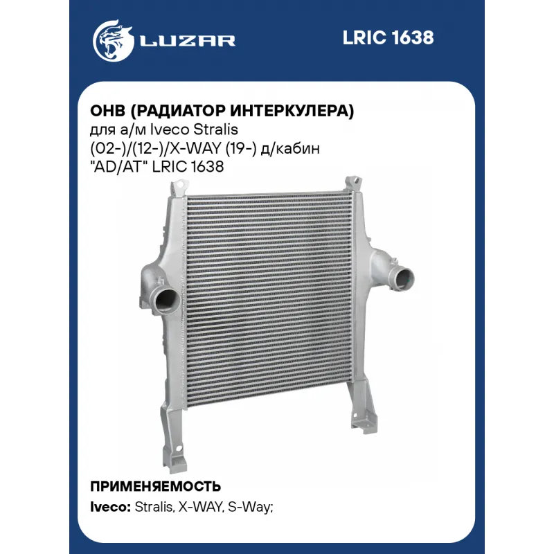 ОНВ (радиатор интеркулера) для а/м Iveco Stralis (02-)/(12-)/X-WAY (19-) д/кабин "AD/AT" Характеристики: Артикул: LRIC 1638 OEM номера: 504015564, 41225406, 41225856, 500060740 Трансмиссия: MT/AT Кондиционер: +/- Длина сердцевины, мм: 652 Высота сердцевины, мм: 769,4 Толщина сердцевины, мм: 50 Материал сердцевины: алюминий Материал бачков: алюминий Тип сердцевины: паяная Сопутствующий товар: Радиаторы охлаждения: LRc 1619; LRc 1620 Подходит для авто: Iveco Stralis (03-), Stralis (12-), X-WAY (19-), S-Way (19-) Для проверки применяемости отправьте VIN автомобиля через вкладку "Есть вопросы о товаре?" Комплектация: Радиатор интеркулера Паспорт изделия Гарантия: от 1 года.