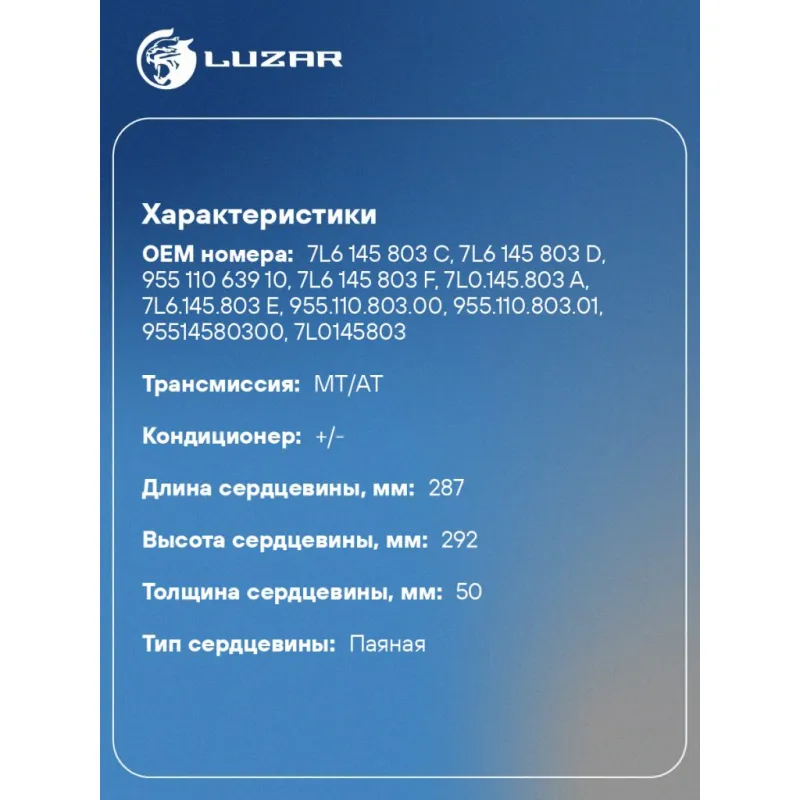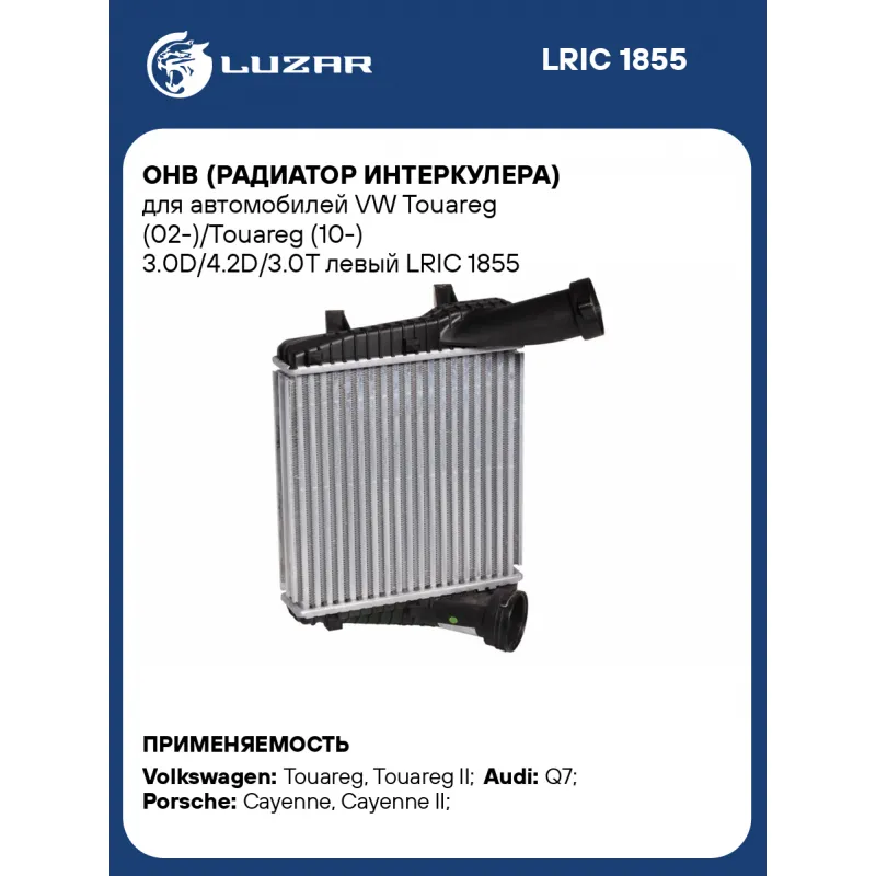 ОНВ (радиатор интеркулера) для автомобилей VW Touareg (02-)/Touareg (10-) 3.0D/4.2D/3.0T левый Характеристики: Артикул: LRIC 1855 OEM номера: 7L6 145 803 C, 7L6 145 803 D, 955 110 639 10, 7L6 145 803 F, 7L0.145.803 A, 7L6.145.803 E, 955.110.803.00, 955.110.803.01, 95514580300, 7L0145803, 7L6145803A, 95511063911 Трансмиссия: MT/AT Кондиционер: +/- Длина сердцевины, мм: 287 Высота сердцевины, мм: 292 Толщина сердцевины, мм: 50 Материал сердцевины: алюминий Тип сердцевины: паяная Сопутствующий товар: Радиаторы охлаждения: LRc 1855; LRc 1856; LRc 1858 Сторона установки: Левая Подходит для авто: Volkswagen Touareg (02-), Touareg II (10-) Audi Q7 (06-) Porsche Cayenne (02-), Cayenne II (10-) Для проверки применяемости отправьте VIN автомобиля через вкладку "Есть вопросы о товаре?" Комплектация: Радиатор интеркулера Паспорт изделия Гарантия: от 1 года.