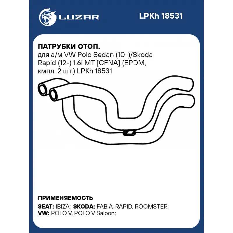 Патрубки отоп. для а/м VW Polo Sedan (10-)/Skoda Rapid (12-) 1.6i MT [СFNA] (EPDM, кмпл. 2 шт.) Характеристики: Артикул: LPKh 18531 OEM номера: 6R0122157B Трансмиссия: MT Кондиционер: + Сопутствующий товар: Радиаторы отопителя: LRh 1853 Количество на автомобиль: 1 Материал: EPDM (Этилен-пропиленовый каучук) Применяемость: СFNA ... Читать полностью →