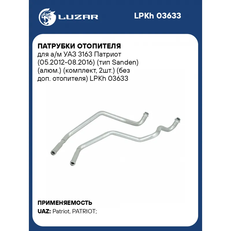 Патрубки отопителя для а/м УАЗ 3163 Патриот (05.2012-08.2016) (тип Sanden) (алюм.) (комплект, 2шт.) (без доп. отопителя) Характеристики: Артикул: LPKh 03633 OEM номера: 3163-00-8101083-87-32B, 3163-00-8101083-87-32, 3163-8101083-87-32Б, 3163-8101083-87-32 Трансмиссия: MT/AT Кондиционер: +/- Сопутствующий товар: Радиаторы отопите... Читать полностью →