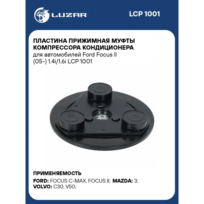 Пластина прижимная муфты компрессора кондиционера для автомобилей Ford Focus II (05-) 1.4i/1.6i Характеристики: Артикул: LCP 1001 OEM номера: 1686883, 3M5H19D629PH, 3M5H19D629PJ, 3M5H19D629PF, 3M5H19D629PE, 3M5H19D629PC, 3M5H19497AC, 3M5H19D629MG, 3M5H19D629PA, 1432767, 1744996, 36000326, 36001440, 36002859, 3M5H19497AA, BV6N19D629AC, 1779739, BV6N19D629AE, 1742258, 3M5H-19D649-FA, 1388316, 1809656, 1432750, 1678411, 3M5H19D629PG, 1856883, BV6N19D629AD Количество на автомобиль: 1 Ограничение производителя: VISTEON Ид.№ компрессора: VS-16 Совместим с компрессорами кондиционера: 1388316, 1432750, 1432767, 1678411, 1742258, 1744996, 1779739, 1809656, 1856883, 36000326, 36001440, 36002859 Совместимость с компрессорами LUZAR: Несовместим Комплектация: Прижимная пластина - 1 шт Гарантия: от 1 года.