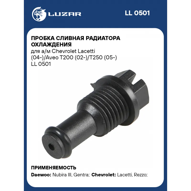 Пробка сливная радиатора охлаждения для а/м Chevrolet Lacetti (04-)/Aveo T200 (02-)/T250 (05-) Характеристики: Артикул: LL 0501 OEM номера: 96413313 Трансмиссия: MT/AT Кондиционер: +/- Сопутствующий товар: Радиаторы охлаждения: LRc CHLt04178; LRc CHLt04244; LRc 0522 Сопутствующий товар: Патрубки охлаждения (комплект): LPK 0552; LPK 0553 Сопутствующий товар: Блоки охлаждения (радиатор + конденсор + вентилятор): LRK 0578 Сопутствующий товар: Бачки расширительные: LET 0572; LET 0581 Количество на автомобиль: 1 Материал: пластик Цвет: черный Комплектация:: пробка с уплотнительным кольцом EPDM Подходит для авто: Daewoo Nubira III (03-), Gentra (13-) Chevrolet Lacetti (02-), Rezzo (00-) Для проверки применяемости отправьте VIN автомобиля через вкладку "Есть вопросы о товаре?" Комплектация: Пробка радиатора Уплотнительное резиновое кольцо Гарантия: от 1 года.