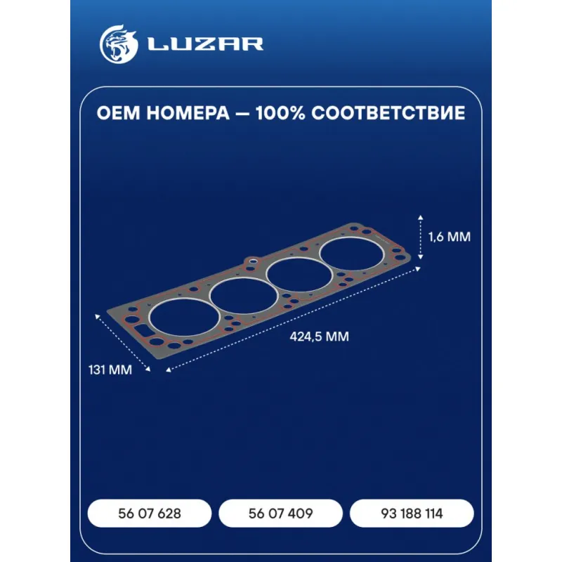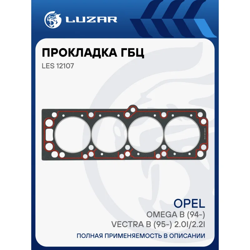 Прокладка ГБЦ для а/м Opel Omega B (94-)/Vectra B (95-) 2.0i/2.2i Характеристики: Артикул: LES 12107 OEM номера: 56 07 628, 56 07 409, 93 188 114 Ширина, мм: 131 Длина, мм: 424.5 Материал прокладки: Безасбестовый полимерный материал на металлическом каркасе Диаметр отверстий, мм: 87.5 Количество слоев: 1 покрытие прокладки: частичное силиконовое (красный цвет) Прокладка, толщина,мм: 1.6 Количество на автомобиль: 1 Комплектация: Прокладка - 1 шт Гарантия: от 1 года.
