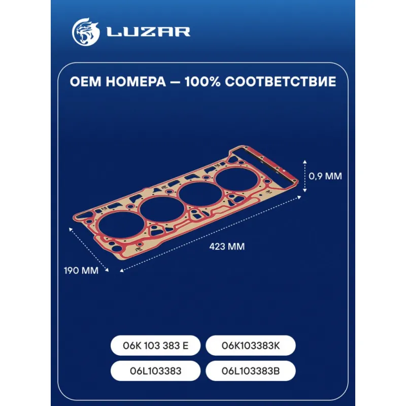 Прокладка ГБЦ для а/м VW Tiguan (16-)/Skoda Octavia (13-)/Kodiaq (16-) 1.8i/2.0i [CZPA; ...] Характеристики: Артикул: LES 11803 OEM номера: 06K 103 383 E, 06K103383K, 06L103383, 06L103383B Ширина, мм: 190 Длина, мм: 423 Материал прокладки: сталь Диаметр отверстий, мм: 83.5 Количество слоев: 3 покрытие прокладки: Частичное FKM с двух сторон Прокладка, толщина,мм: 0,9 Количество на автомобиль: 1 Комплектация: Прокладка - 1 шт Гарантия: от 1 года.