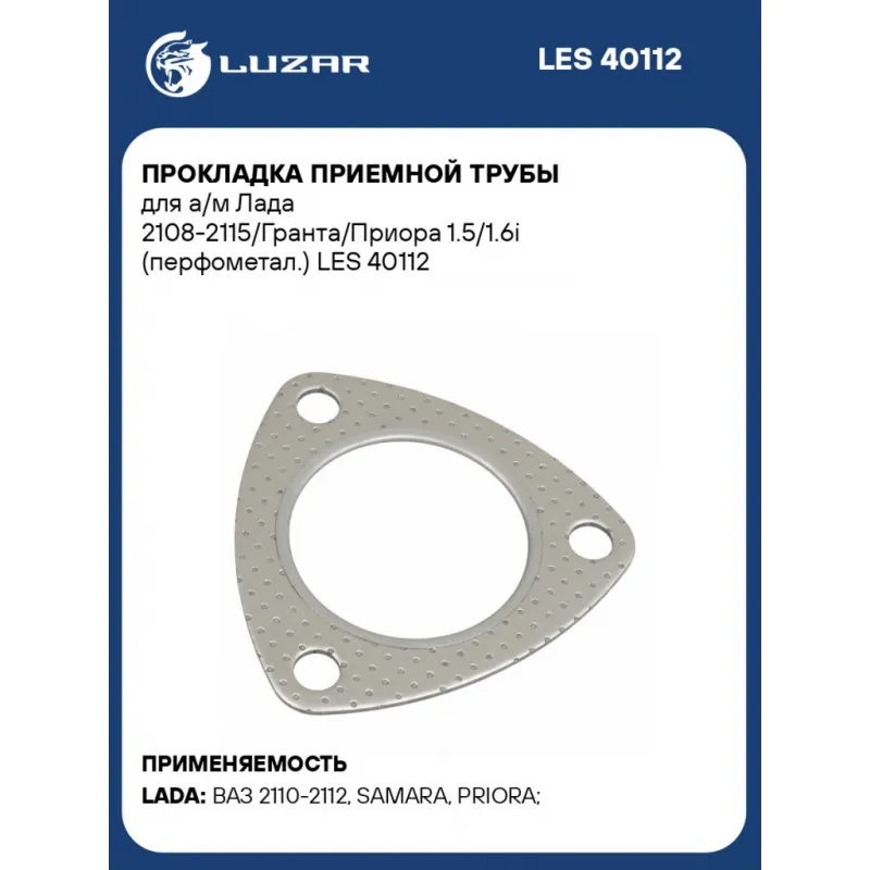 Прокладка приемной трубы для а/м Лада 2108-2115/Гранта/Приора 1.5/1.6i (перфометал.) Характеристики: Артикул: LES 40112 OEM номера: 2110-1203021, 21100-1203021-12 Материал прокладки: усиленный с двух сторон безасбестовый композитный материал на металлическом каркасе Количество слоев: 1 Комплектация: Прокладка Гарантия: от 1 года.