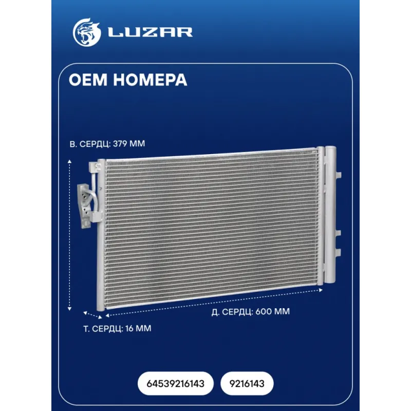 Радиатор кондиционера для автомобилей BMW X3 (F25) (10-)/BMW X4 (F26) (14-) Характеристики: Артикул: LRAC 2603 OEM номера: 64539216143, 9216143 Количество на автомобиль: 1 Длина сердцевины, мм: 600 Высота сердцевины, мм: 379 Толщина сердцевины, мм: 16 Сопутствующий товар: Радиаторы охлаждения: LRc 26181 Сопутствующий товар: Электровентиляторы охлаждения: LFK 2618 Сопутствующий товар: Клапаны расширительные кондиционера (ТРВ): LTRV 26173 осушитель: + Подходит для авто: BMW X3 F25 (10-), X4 F26 (14-) Для проверки применяемости отправьте VIN автомобиля через вкладку "Есть вопросы о товаре?" Комплектация: Паспорт изделия - 1 шт Радиатор кондиционера c ресивером - 1 шт Гарантия: от 1 года.